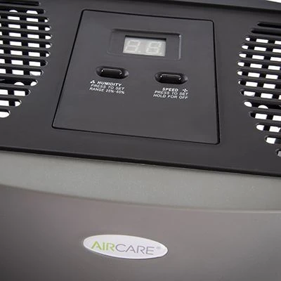 The AIRCARE® Evaporative Tower Humidifier has an automatic humidistat, known as a hygrometer, located on the cord that senses the humidity level around the immediate area of the humidifier. To set your desired humidity level, press the humidity button and it will adjust in 5% increments, the range is 25% to 65%. (At 65% the humidifier will run constantly until it runs out of water). The hygrometer reads the current room humidity and displays it on LCD panel. Control lock is an added feature of the AIRCARE® Tower humidifier. Use control lock to avoid unwanted tampering with the humidifier settings the controls.