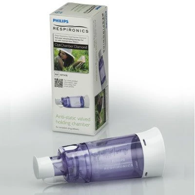 The intuitive design of the Philips Respironics OptiChamber Diamond VHC (valved holding chamber) allows more respirable drug to be delivered, makes it easier to use, and increases patient compliance. The clear, anti-static chamber and a low resistance expiratory valve help measure breath count and breath hold. For use with inhaled steroids and long-acting and rescue pressurized metered dose inhaler (pMDI) medications. Potentially more respirable drug delivered with the OptiChamber Diamond than with a pMDI alone. With quality and reliability you can trust from Philips Respironics. Replace after one year. Box contains one (1) OptiChamber Diamond VHC (single-patient use).