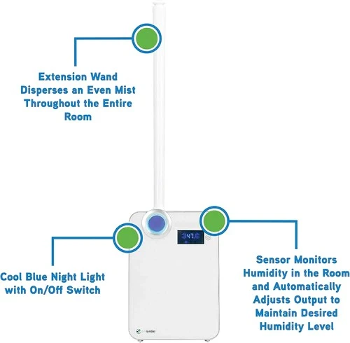 - Multi‐height mist extension wands disperse mist evenly throughout room