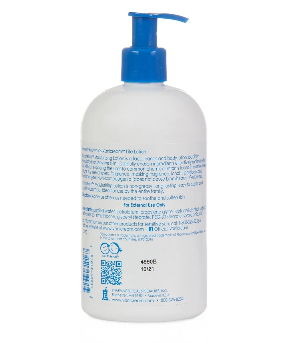 Vanicream™ Moisturizing Lotion provides all the same moisturizing benefits of Vanicream Skin Cream, but in a lighter formulation. Vanicream’s Moisturizing Lotion (formerly named Vanicream Lite Lotion) spreads the fastest over face, feet, hands and body to soothe and hydrate skin without a greasy after-feel. Formulated for those with sensitive skin, this Moisturizing Lotion is often recommended by dermatologists for its gentle, non-irritating qualities. Vanicream’s light therapeutic lotion helps to ease the annoying and sometimes painful effects of eczema, psoriasis, winter-itch, and other skin conditions. A refreshing alternative to often irritating skin lotions, Vanicream’s lotion contains NO perfume, dyes, lanolin, parabens, formaldehyde, or any other common irritant.
